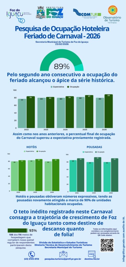 Para o Secretário de Turismo, Jin Petrycoski, a soma coloca Foz como um destino consolidado no cenário nacional. “Alcançar 89% de ocupação média, superando inclusive a nossa própria expectativa, demonstra a força do planejamento integrado entre poder público e trade turístico. O Carnaval já se firma como um dos períodos mais estratégicos do nosso calendário, impulsionando a economia e movimentando a rede hoteleira, tanto para quem busca lazer e natureza quanto para quem vem para aproveitar a programação cultural”, destaca.